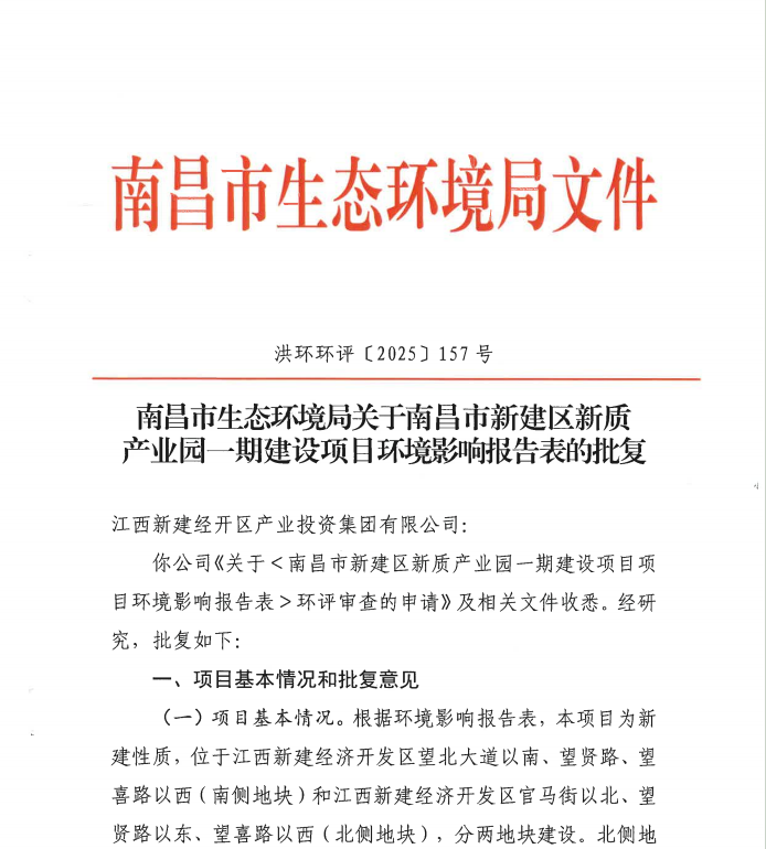 该项目于2025年10月20日取得了南昌市生态环境局颁发的批复文件。(洪环环评〔2025]157号)