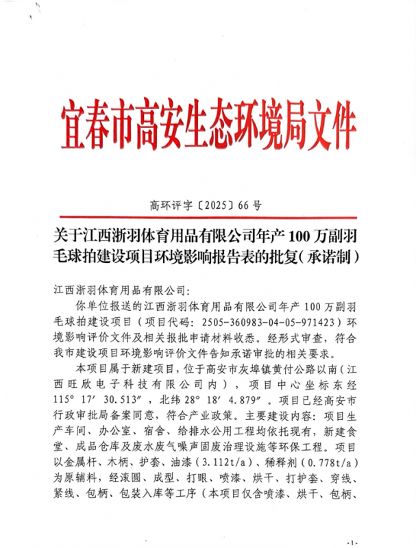 江西浙羽体育用品有限公司位于高安市灰埠镇黄付公路以南(江西旺欣电子科技有限公司内),项目中心坐标东经115°17’30.513",北纬28°18’4.879″。项目已经高安市行政审批局备案同意,符合产业政策。主要建设内容:项目生产车间、办公室、宿舍、给排水公用工程均依托现有,新建食堂、成品仓库及废水废气噪声固废治理设施等环保工程。项目以金属杆、木柄、护套、油漆(3.112t/a)、稀释剂(0.778t/a)为原辅料,经滚圆、成型、打眼、喷漆、烘干、打护套、穿线、紧线、包柄、包装入库等工序(本项目仅含喷漆、烘干、包柄、包装入库工序,其余工序外包)得到年产羽毛球拍100万副的生产规模。