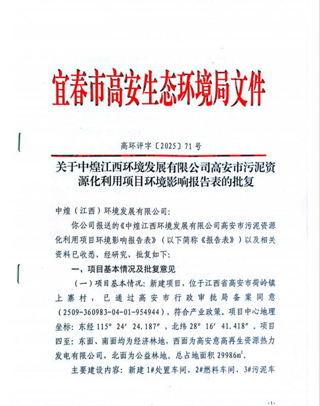 该项目于2025年10月28日取得了宜春市高安生态环境局颁发的批复文件。(高环评字〔2025]71号)